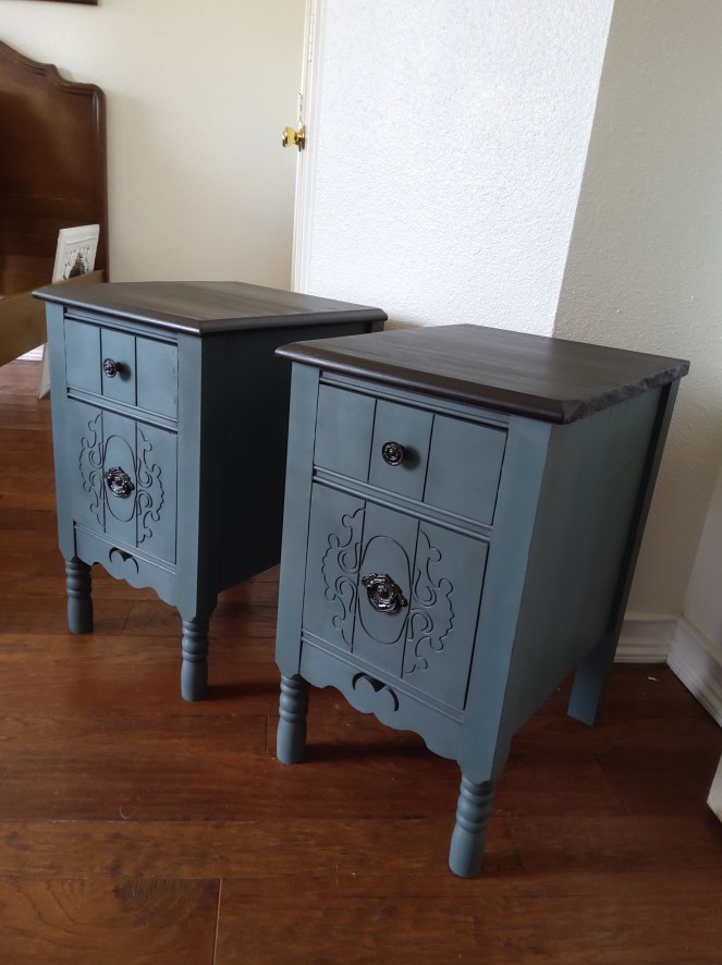 These night stands were painted in Dixie Belles “Stormy Seas”, the top received two coats of our No Pain Gel Stain in “Colonial Black ” , top was sealed with Satin finish and the body was clear waxed and then I played with details with black wax.