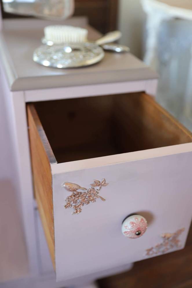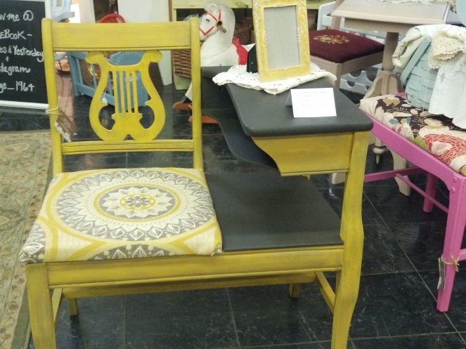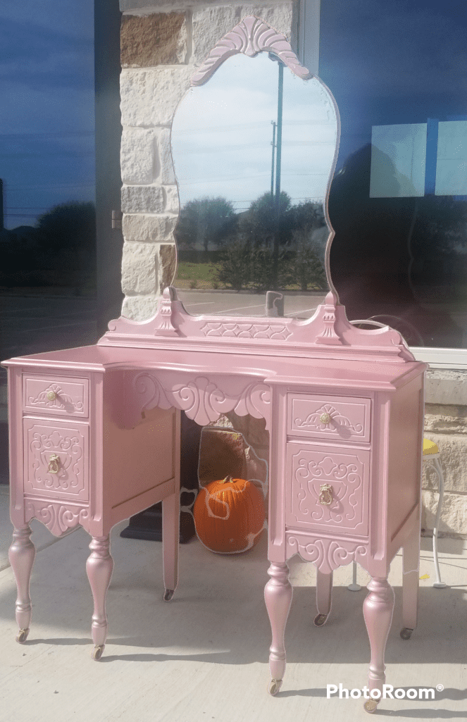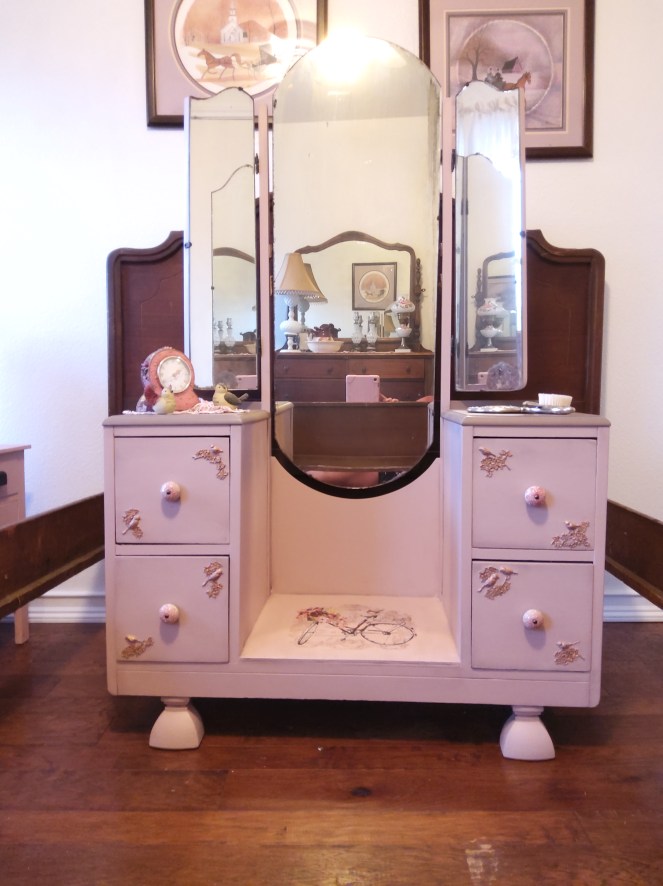 Vintage telephone bench painted in Colonel Mustard and Coffee Bean.This vintage vanity with trifold mirrors was one of my favorite pieces to do 🥰 painted in Tea Rose and Mud Puddle with grunge gray glaze to accent . I added the decorative wood birds and branches. New knobs and a cute bike transfer finished off the look.